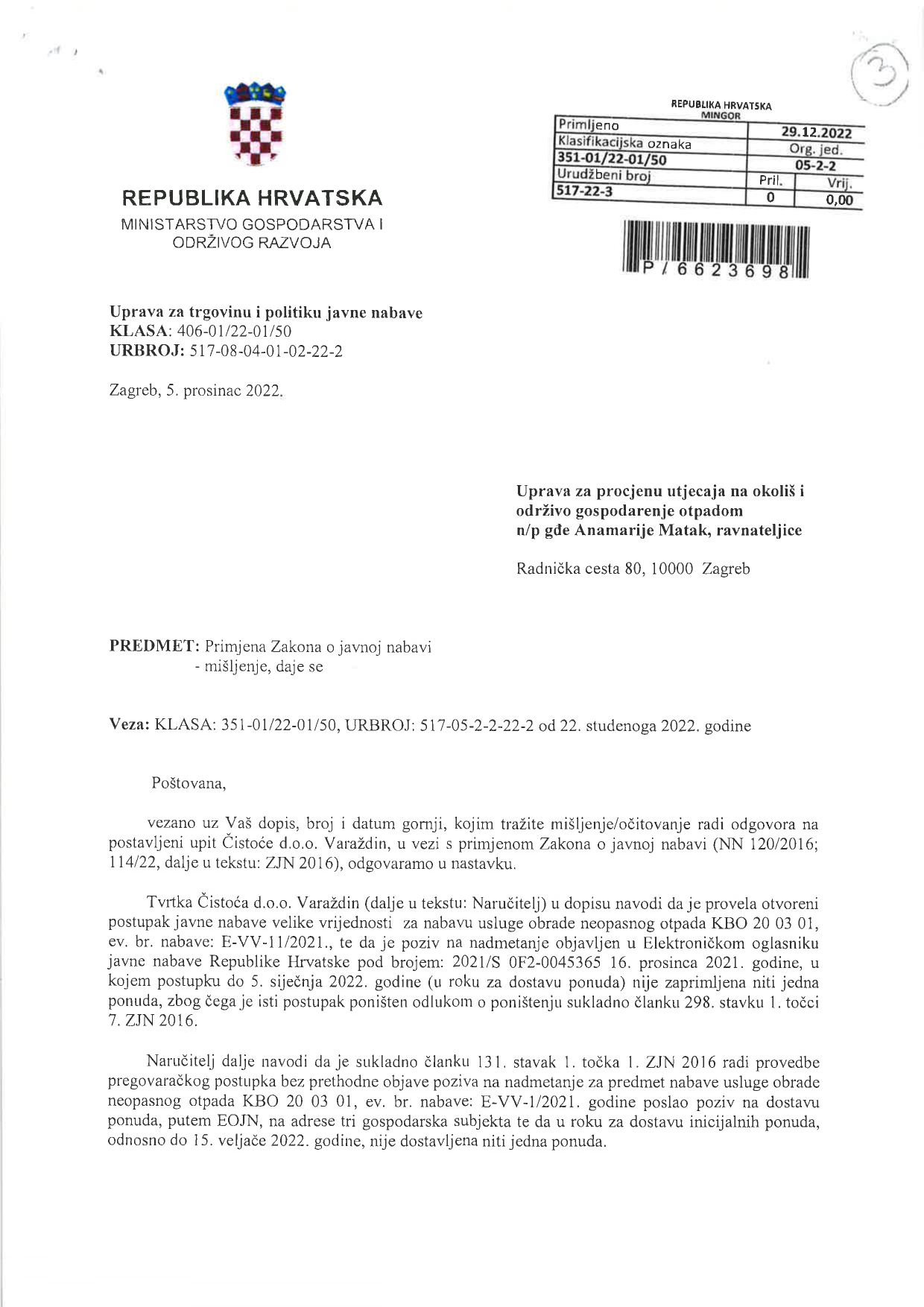 održivog razvoja na pitanje o načinu provedbe javne nabave.
