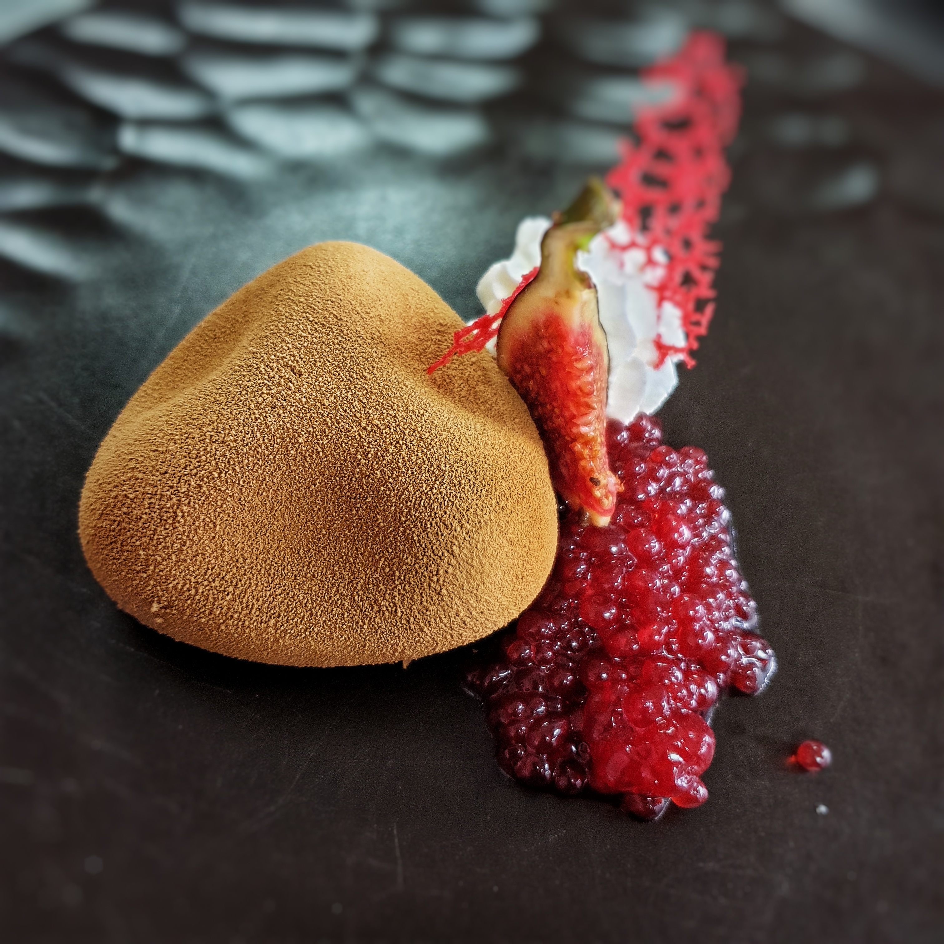 biskvit od tamne čokolade, umak od šumskog voća