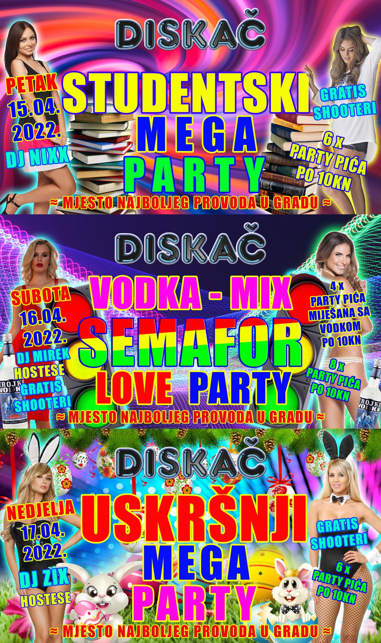 I ovog vikenda u Diskaču vas očekuje odlična zabava, uz odlične cijene pića po 10 kuna i brojna iznenađenja tu je i prvi trio-vikend, a dobra vijest je i uz produženo radno vrijeme, od 21h do 05h ujutro.