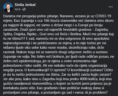 početka pandemije koronavirusa, a Jenkač se pitao u svom statusu