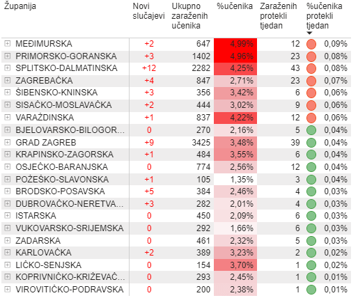 Najviši postotak zaraze koronavirusom među učenicima imaju četiri županije.