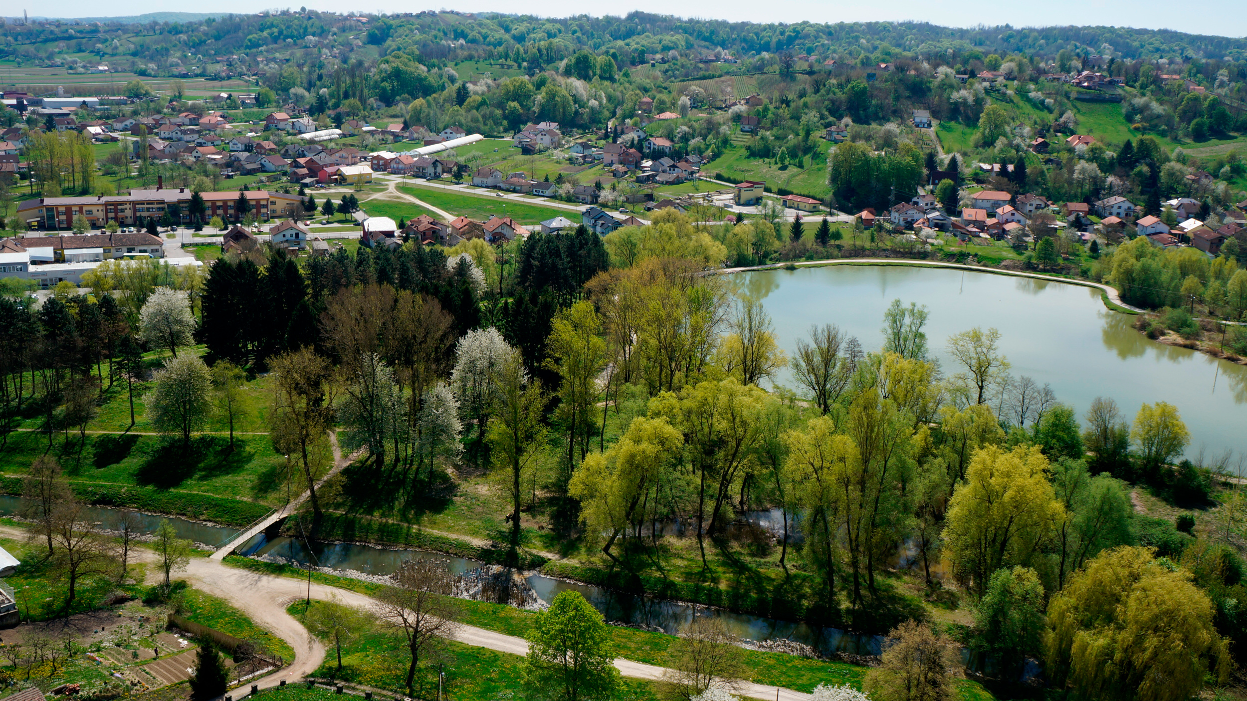 okružen ribnjacima, nasipima, šumarcima koje je okruženo rijekom