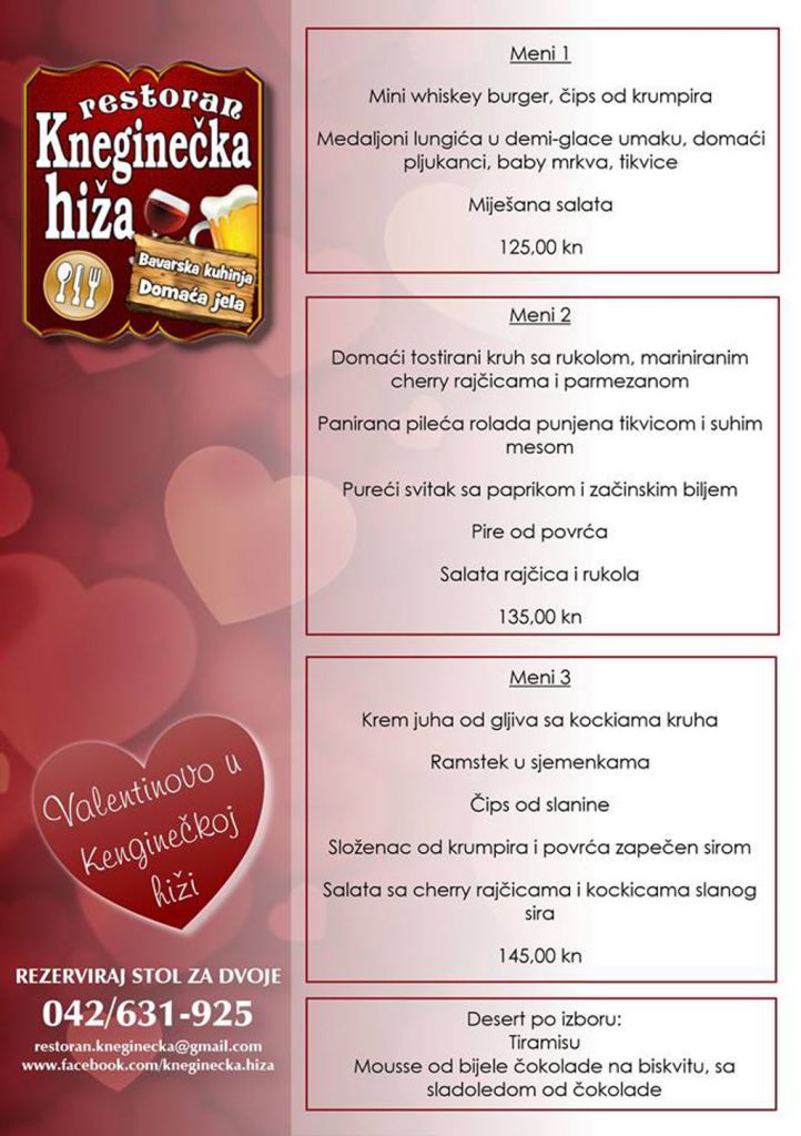 Obzirom da je Valentinovo jedan od važnijih dana u godini za zaljubljene, kako biste izbjegli neugodnosti i nedostatak mjesta u restoranu, preporučamo da rezervirate svoja mjesta već danas, a to možete učiniti na broju telefona 042/631 925), mailom na restoran.kneginecka@gmail.com ili putem Facebook stranice.
