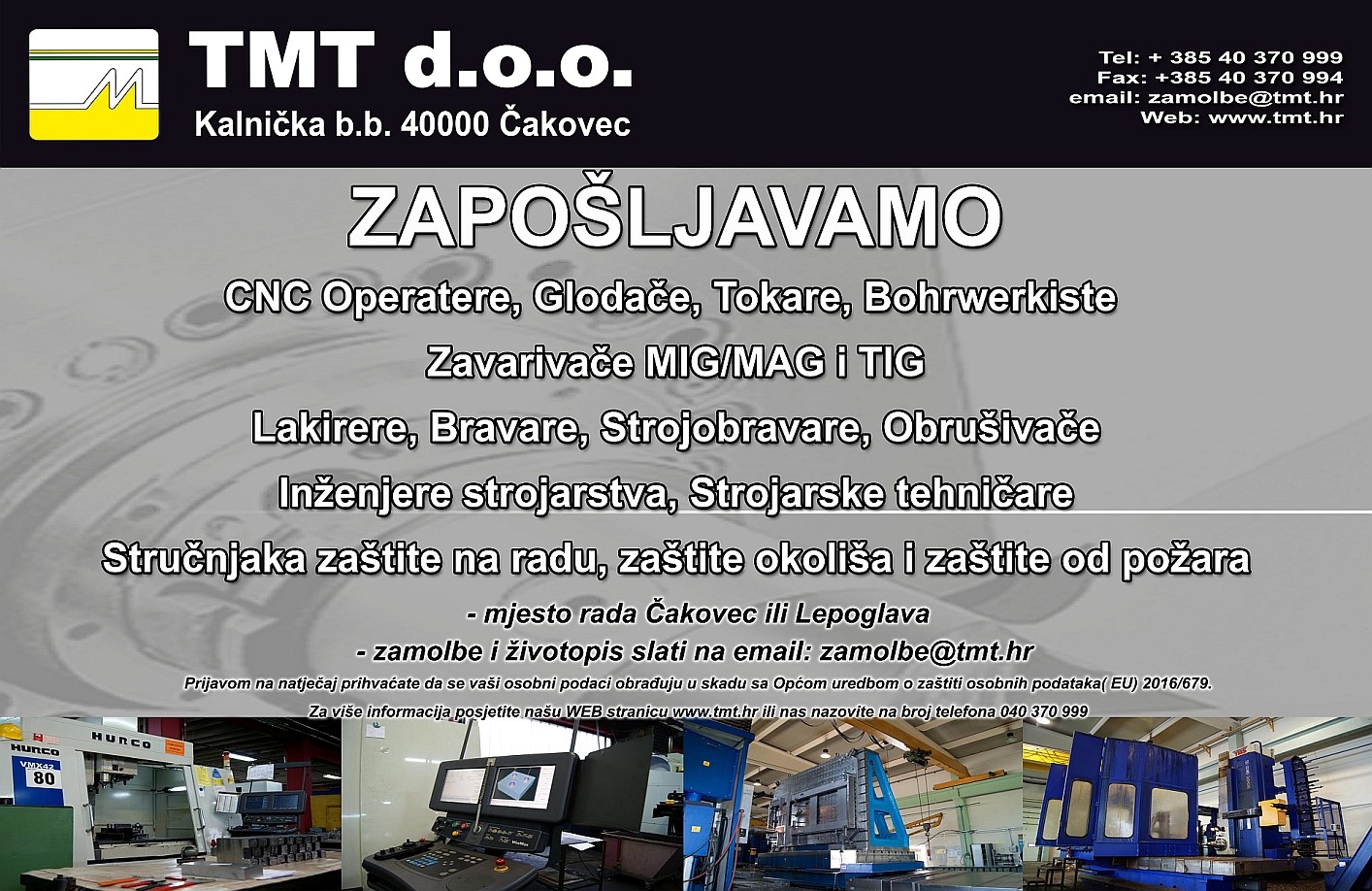 Zapošljavamo: radnike na CNC glodalicama, CNC tokarilicama, CNC bohrwercima, Zavarivače MIG/MAG i TIG, Bravare, Strojobravare, Obrušivače, Inženjere strojarstva, Strojarske tehničare, Stručnjaka zaštite na radu, zaštite okoliša i zaštite od požara