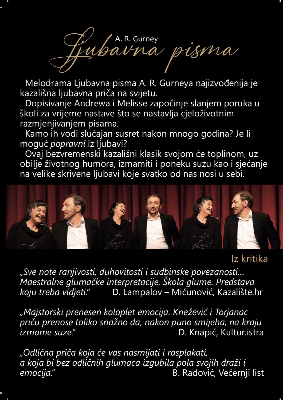 Kazalište Planet Art s kazališnim hitom "Ljubavna pisma" ponovno dolazi u Varaždin u petak, 15. prosinca u 20 sati, ovaj put u Kino Gaj, a u predstavi glumi bivši bračni par Slavica Knežević i Marko Torjanac.
