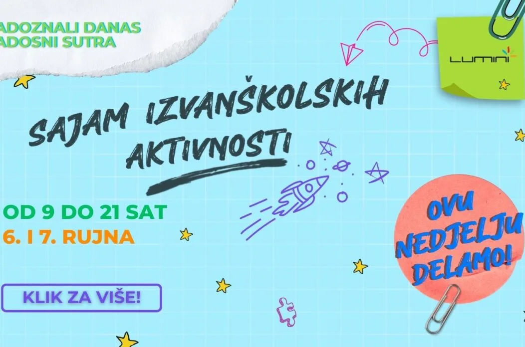Drugi po redu i najveći Sajam izvanškolskih aktivnosti u sjeverozapadnoj Hrvatskoj održava se upravo u Lumini centru. Tijekom subote i nedjelje, od 9 do 21 sat, više od 20 izlagača predstavit će programe i aktivnosti iz područja sporta, glazbe, plesa, umjetnosti, znanosti, folklora i volonterstva. Posjetitelji će imati priliku upoznati trenere, mentore i voditelje te pronaći idealne aktivnosti za slobodno vrijeme svojih mališana.