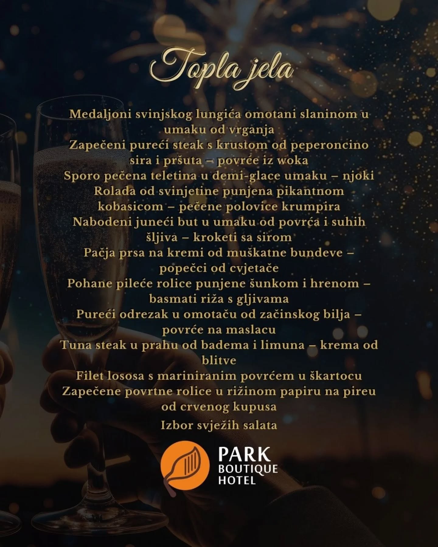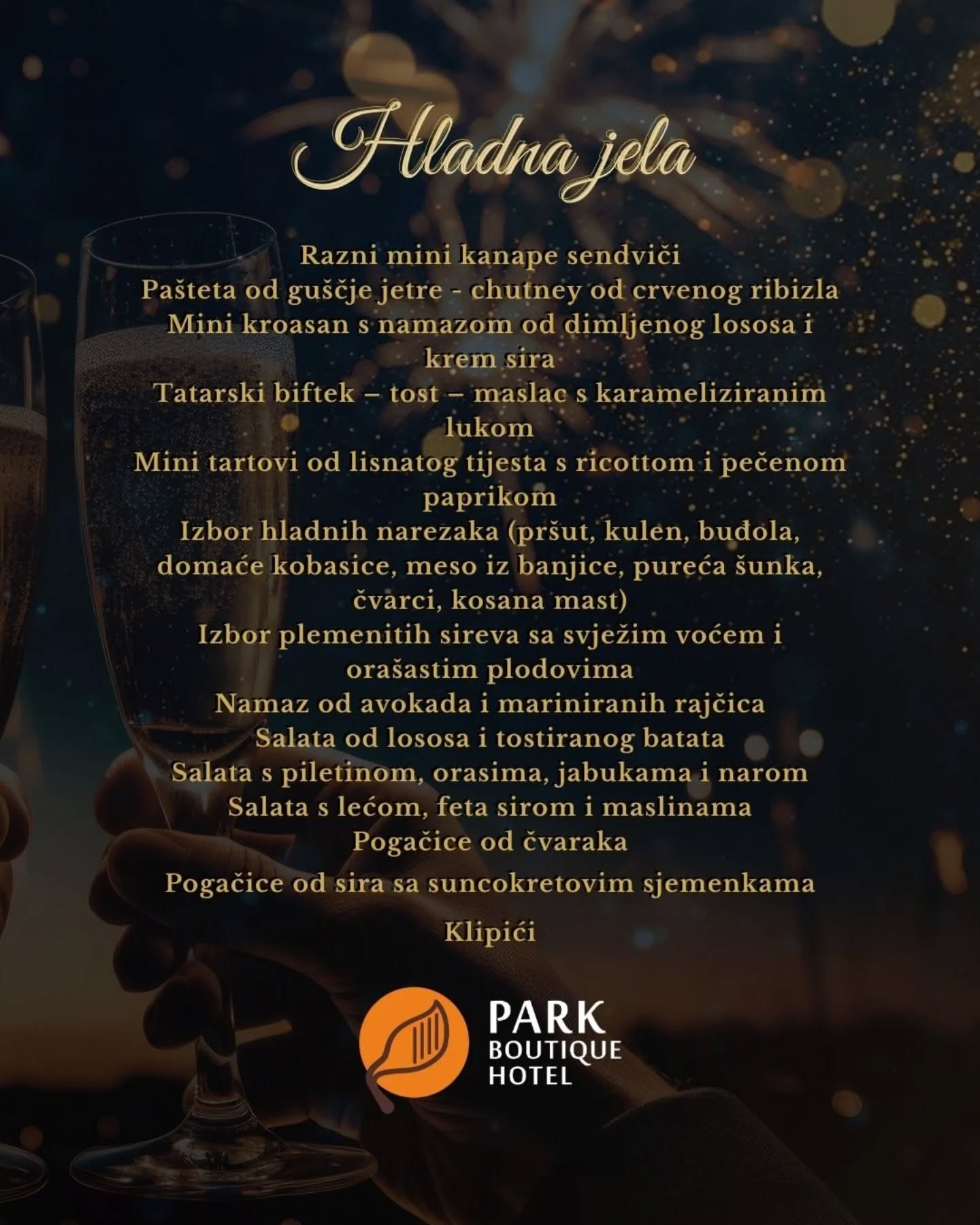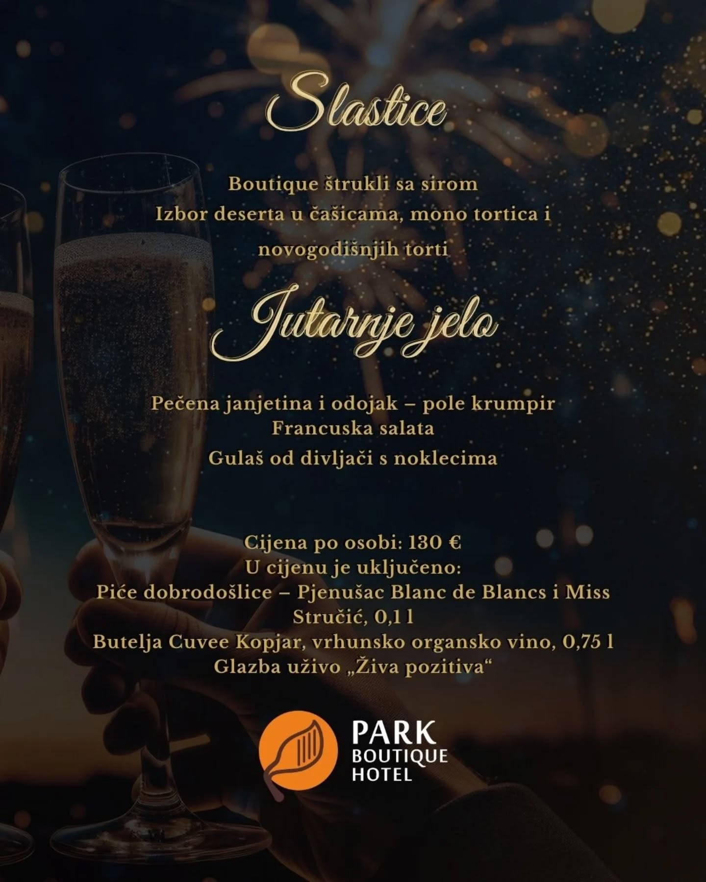 Organizatori ističu kako se u Park Boutique Hotelu Nova godina ne “čeka”, nego se slavi uz pjesmu, ples i maksimalno uživanje. Bogat buffet uključuje niz toplih i hladnih specijaliteta, deserte koji osvajaju na prvi zalogaj te jutarnje jelo nakon ponoćne zabave, a sve je zamišljeno kao iskustvo koje se pamti.