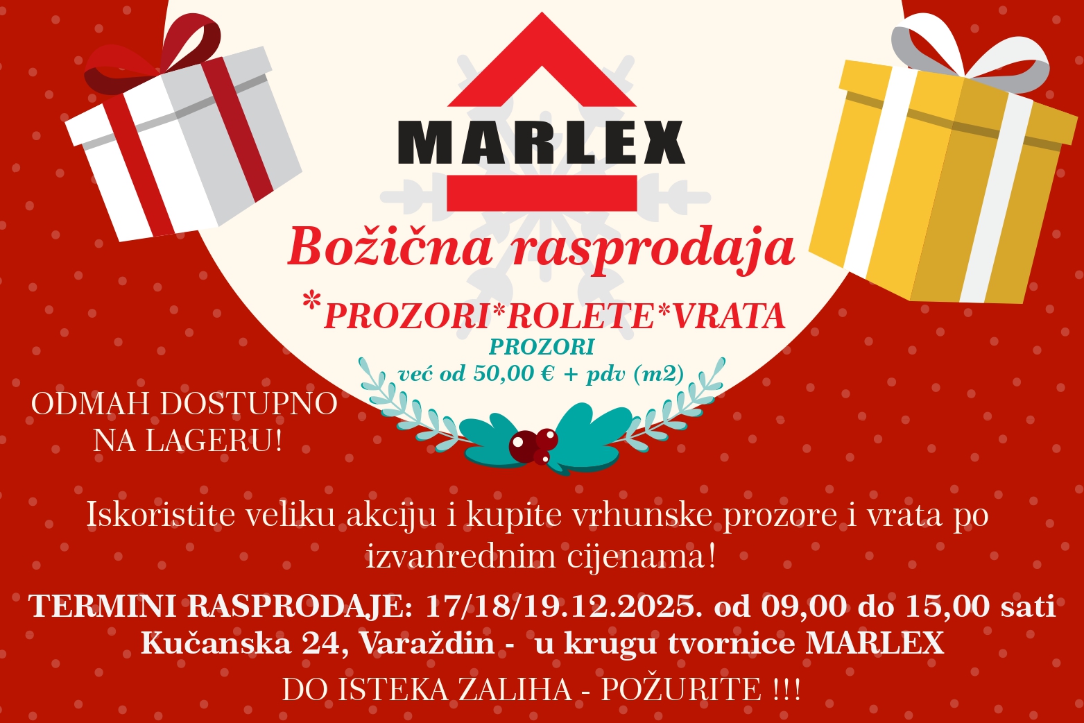 Tvrtka Marlex d.o.o., renomirani hrvatski proizvođač PVC i aluminijske stolarije te IZO stakala sa sjedištem u Varaždinu, pripremila je posebnu božićnu rasprodaju za sve koji žele unaprijediti svoj dom kvalitetnim prozorima i vratima. Poznata po visokoj kvaliteti proizvoda i dugogodišnjem iskustvu, Marlex je danas jedan od vodećih proizvođača stolarije u Hrvatskoj, s prisutnošću na tržištima diljem Europe i svijeta.