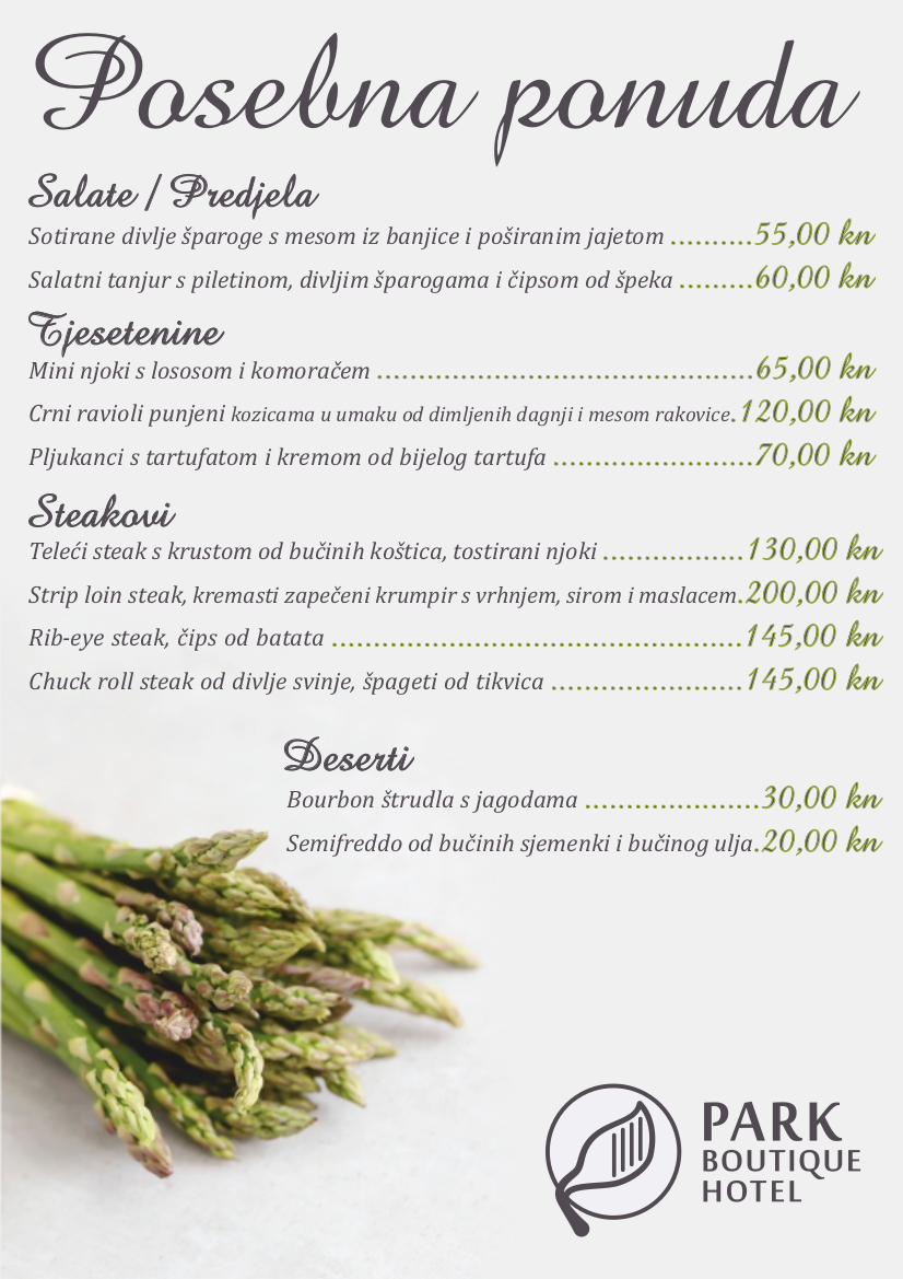 Poseban gurmanski užitak pripremili su vam u Park Boutique hotelu, gdje možete probati kreativna jela od šparoga, tjestenina, vrhunske steakove i deserte.