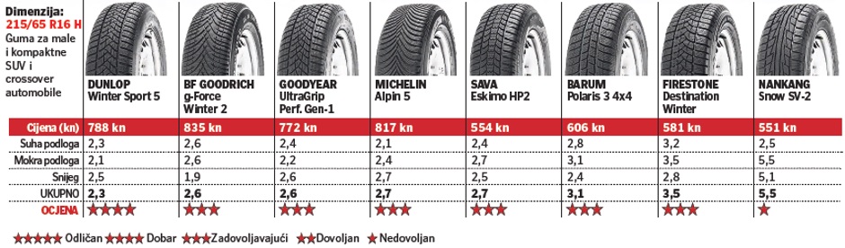 U kategoriji guma širine 215 samo je jedan model ocijenjen kao dobar, a to je Dunlopov Winter Sport 5. Najbolji odnos cijene i kvalitete u ovoj kategoriji uvjerljivo nudi Sava Eskimo HP2, s ocjenama koje su malo iznad prosjeka i cijenom koja je 30% niža od cijena najboljih modela ove dimenzije. U ovoj kategoriji nalazimo i jedinu gumu koja nije prošla ne testu. Nankang Snow SV-2 vrlo je loš na mokrom i na snijegu te je zbog toga dobio ocjenu nedovoljan.