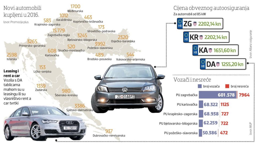 Primjerice, prošle je godine Požeško-slavonska županija, prema podacima Promocije plus, imala 3992 registracije novih automobila i izbila je na drugo mjesto, odmah iza zagrebačke regije (Grad Zagreb i Zagrebačka županija) s 15.779 registracija, a ispred Splitsko-dalmatinske županije (3386) i Primorsko-goranske županije (3265).