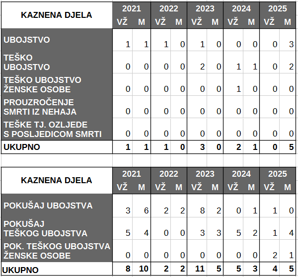 Uz to, zabilježeno je i pet pokušaja teškog ubojstva.