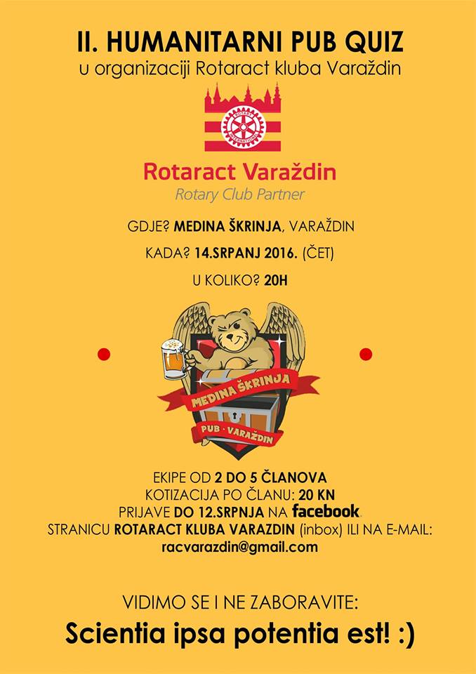 U četvrtak, 14. srpnja, u Medinoj škrinji u Varaždinu, s početkom u 20 sati održati će se II. humanitarni pub quiz, u organizaciji Rotaract kluba Varaždin.