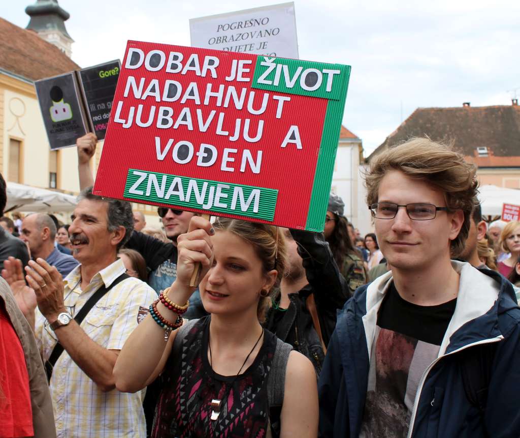 Takva se bar ocjena može dati sudeći prema atmosferi na varaždinskom glavnom gradskom trgu i broju građanki i građana koji su se okupili, oboružani raznim transparentima: ‘VŽ nije hrastova šuma’, ‘Konji se rađaju, ali ljudi ne, ljudi se obrazuju’, ‘Kakva škola danas, takva Hrvatska sutra’, ‘Ja nisam ovca!’, ‘Dajmo djeci da razumiju svijet, a ne da ga se boje’, ‘Želim ih učiti da poštuju različitost’, ‘Neću bubati, hoću razumjeti’, ‘I učiti treba naučiti’, ‘Hoću da moje dijete misli svojom glavom’, ‘Dobar je život nadahnut ljubavlju, a vođen znanjem’…