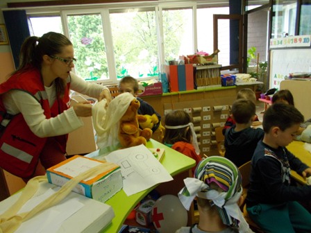 Kroz priču o medvjediću Jurici Lucija Loparić iz Gradskog društva Crvenog križa Ivanec objasnila je vrtićkim mališanima iz starije skupine kako pružiti pomoć unesrećenom kod lakših ozljeda. Djeca su na plišanom medvjediću učila kako sanirati ogrebotinu, a naučila su i da kod teže ozljede treba nazvati brojeve 112 ili 194. Na kraju radionice crtežima su dočarali sve što su naučili.