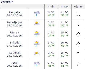 Prvog radnog dana, 25. travnja, bit će nešto sunčanije no u nedjelju. Nebo će tako biti umjereno oblačno, bez naznake kiše. Temperatura neće biti bitno drugačija od nedjeljne, rasti će do najviše 11 stupnjeva celzijevih. Vjetar će biti slab do umjeren sjeverni.
