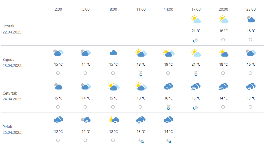 U četvrtak će prevladavati oblačno vrijeme s čestim kišnim razdobljima. Jutarnje temperature će biti oko 14 °C, a najviša dnevna temperatura neće prelaziti 18 °C. Kiša se očekuje tijekom većeg dijela dana, a temperature će biti nešto niže u odnosu na srijedu.