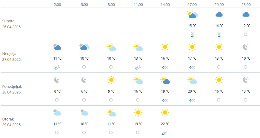 U ponedjeljak se očekuje nešto više oblaka, osobito tijekom prijepodneva, no i dalje će biti dosta sunčanih razdoblja. Mogućnost za kraću i slabu kišu postoji uglavnom u drugom dijelu dana, ali značajnijih oborina neće biti. Temperature će ostati slične kao u nedjelju, s najvišim dnevnim vrijednostima između 19 i 20 °C. Vjetar će biti slab do umjeren, povremeno sjeverozapadni. Sve u svemu, predstoji nam ugodan i topao proljetni početak tjedna, pogodan za boravak na otvorenom.