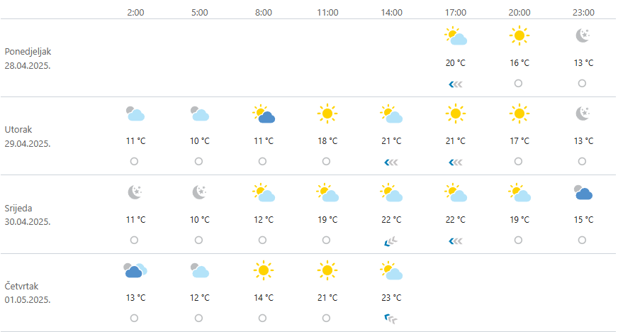 U srijedu će se nastaviti slično vrijeme. Jutarnje temperature bit će slične kao dan ranije, oko 10 do 12 °C, dok će najviša dnevna temperatura doseći 22 °C. Unatoč mogućim kraćim pljuskovima, veći dio dana bit će topao i ugodan, a vjetar će i dalje biti slab do umjeren.