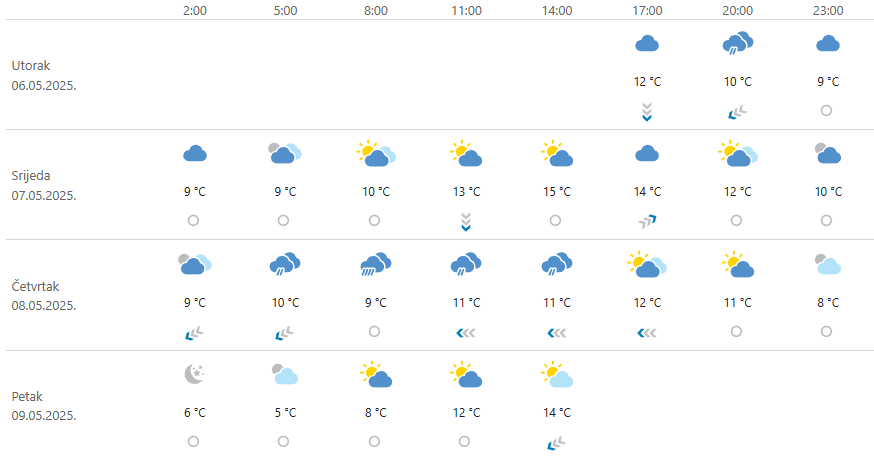 U četvrtak se nastavlja svježije vrijeme s jutarnjom temperaturom oko 9 °C, a najviša dnevna temperatura bit će oko 12 °C. Tijekom dana prevladavat će promjenjiva naoblaka, a veći dio dana ostat će suho. Vjetar će biti slab, a mogućnost oborina i dalje je vrlo mala.