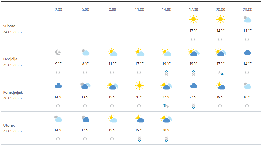Tijekom dana očekuje se porast temperature do 22 °C, a oblaci će povremeno prolaziti, no i dalje bez značajnije mogućnosti za oborine.