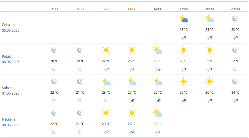 Subota donosi nastavak stabilnog i sunčanog vremena, uz još malo više temperature u odnosu na petak. Jutro će biti ugodno s oko 23°C, a tijekom dana temperatura će rasti do 29°C. Poslijepodne i večer također će biti topli, što znači da će vikend biti idealan za razne aktivnosti na otvorenom.