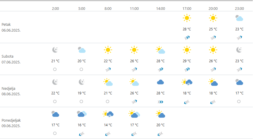 Nedjelja donosi još toplije vrijeme, s jutarnjim temperaturama oko 20 °C i brzim porastom do čak 30 °C tijekom poslijepodneva. Prevladavat će pretežno vedro nebo, a mogućnost oborina ostaje vrlo niska. U najtoplijem dijelu dana može biti vruće, pa se preporučuje izbjegavanje izlaganja suncu oko podneva, kao i unos dovoljno tekućine.