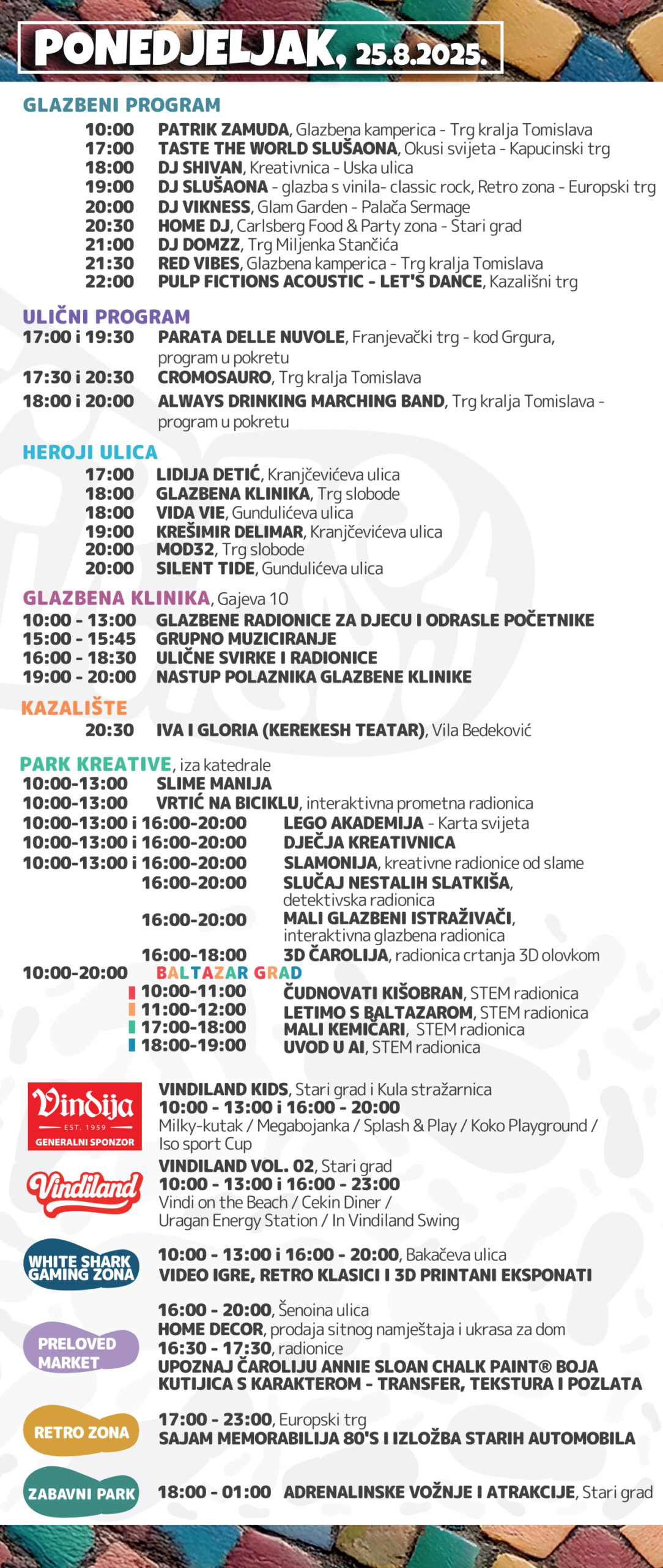 Tijekom večernjih sati tu će biti razni DJ-evi raspoređeni od Kreativnice, Europskog trga, Glam Gardena, Party zone Stari grad, Trga Miljenka Stančića, dok će navečer u 21:30 na Glazbenu kampericu doći Red Vibes.