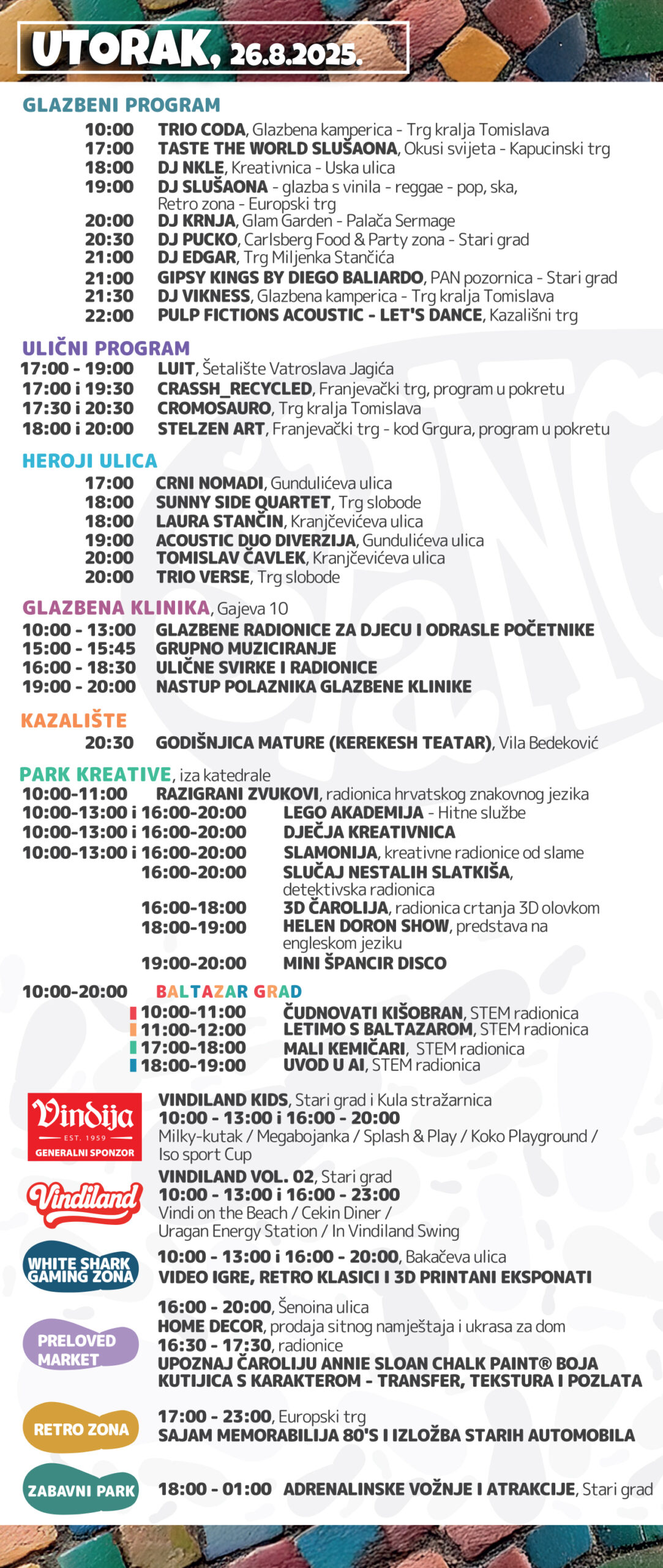 Na Starom gradu koncert će održati Gipsy Kings by Diego Baliardo, a kod Vile Bedeković održat će se predstava Kerekesh Teatra, Godišnjica mature. DJ-evi će svirati na nekoliko lokacija u gradu. Cijeli program pogledajte ovdje.