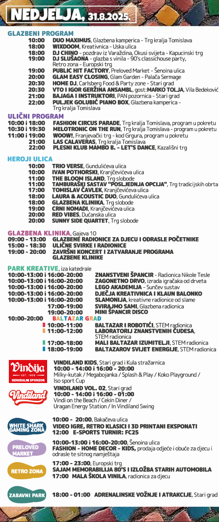 “Iza nas su dani ispunjeni nezaboravnim trenucima i tisućama koraka po ulicama Varaždina koje su ponovno oživjele u svom najljepšem izdanju. Danas je prilika da još jednom doživite jedinstvenu festivalsku atmosferu, poslušate omiljene izvođače, uživate u uličnim performansima, kušate eno i gastro delicije, istražite ponudu kreativnog i umjetničkog stvaralaštva i uključite svoje mališane u brojne dječje programe”, poručuju organizatori.