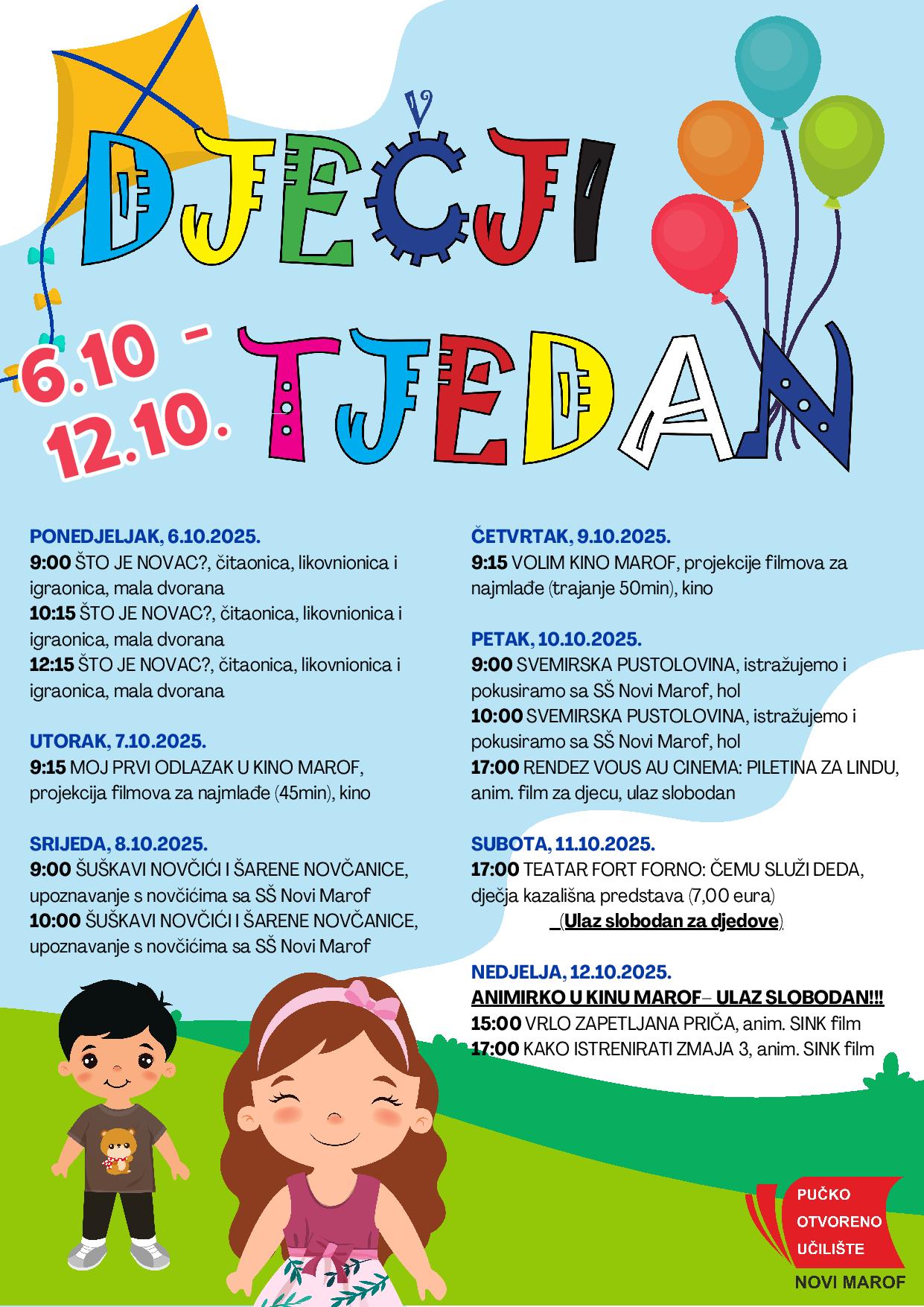 Ove godine u Kulturnom centru “Ivan Rabuzin” Novi Marof Dječji tjedan će se obilježiti od 6. do 12. listopada 2025.g. i aktivnosti su namijenjene djeci vrtića s područja grada Novog Marofa u tjednu 6.-10.10.2025. dok su aktivnosti 11. i 12.10.2025. otvorene za javnost.
