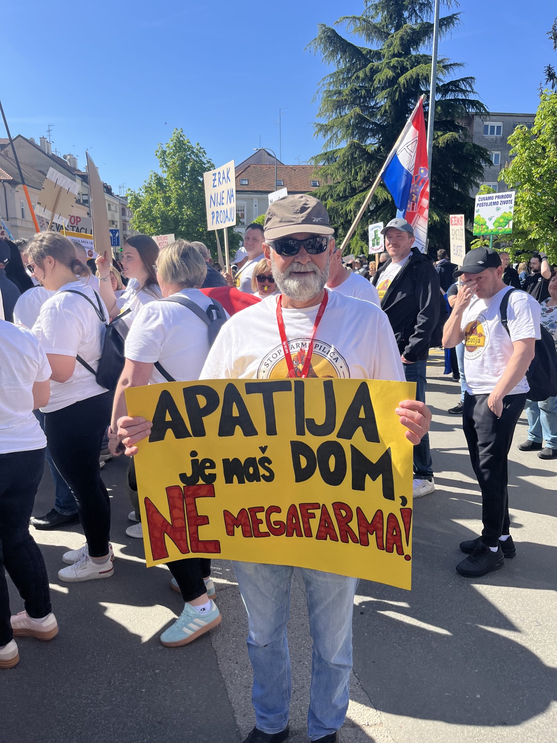 „Nije gotovo, dok nije gotovo – mi nastavljamo dalje!“, oštra je poruka s prosvjeda protiv izgradnji megafarmi i klaonica pilića stranih investitora u Hrvatskoj na kojem se ove subote, 25. travnja u Sisku okupilo oko 3000 ljudi iz 12 građanskih inicijativa iz Sisačko-moslavačke, Zagrebačke, Koprivničko-križevačke županije, ali i inicijativa građana iz Apatije kraj Ludbrega iz Varaždinske županije.