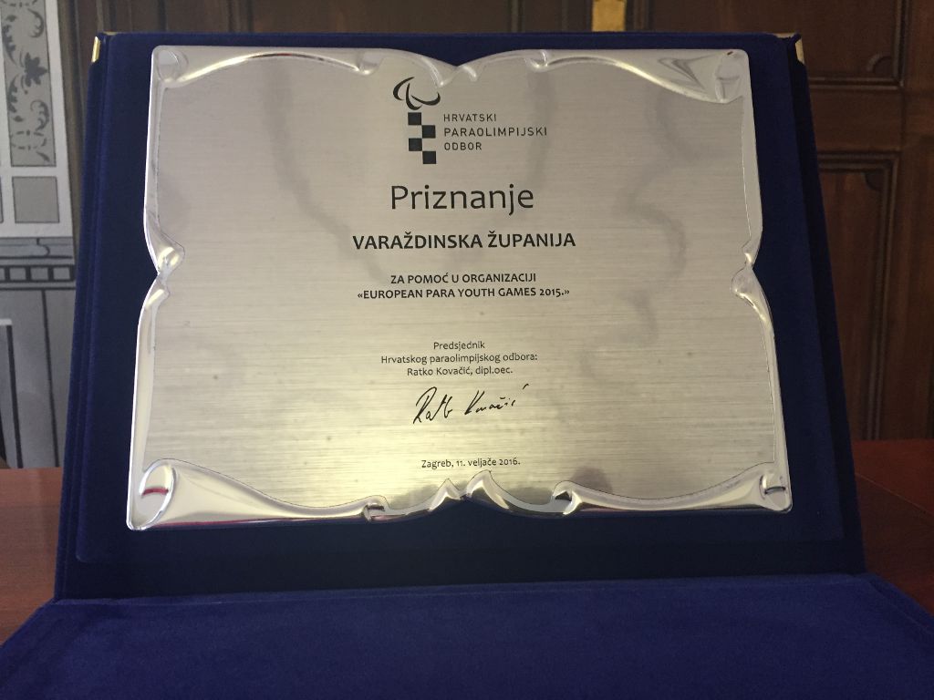 Na jučerašnjoj svečanosti hrvatskog paraolimpijskog sporta na Zagrebačkome velesajmu uz već tradicionalno proglašenje najuspješnijih sportaša u 2015. godini, Varaždinskoj županiji dodijeljeno je posebno priznanje za pomoć u organizaciji Europskih igara mladih za osobe s invaliditetom koje je održano u Varaždinskoj županiji 2015 godine.