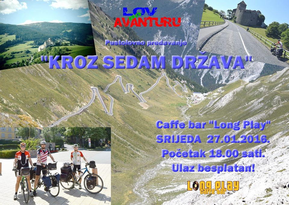 Lov na avanturu poziva vas ove srijede, 27. siječnja s početkom u 18 sati u caffe bar ‘Long Play’, Anina 2, na novo pustolovno predavanje u slikama i riječi. Riječ je o avanturi biciklom ‘Kroz sedam zemalja’. Marko Košćak, Branimir Šafran i Ivan Heged iz BK Maraton Novi Marof zaputili su se biciklima od rodnog grada do Švicarske.