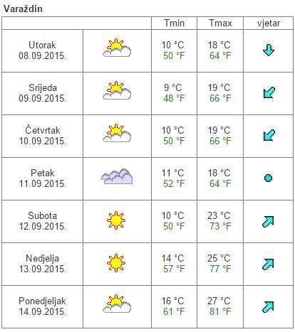 Do kraja tjedna, prema DHMZ-u, najniža dnevna temperatura na varaždinskom području biti će 9 stupnjeva celzijusa već od srijede, a prevladavat će mjestimično oblačno vrijeme, dok se za vikend očekuje razvedravanje i rast temperatura do maksimalnih 25 stupnjeva celzijusa.