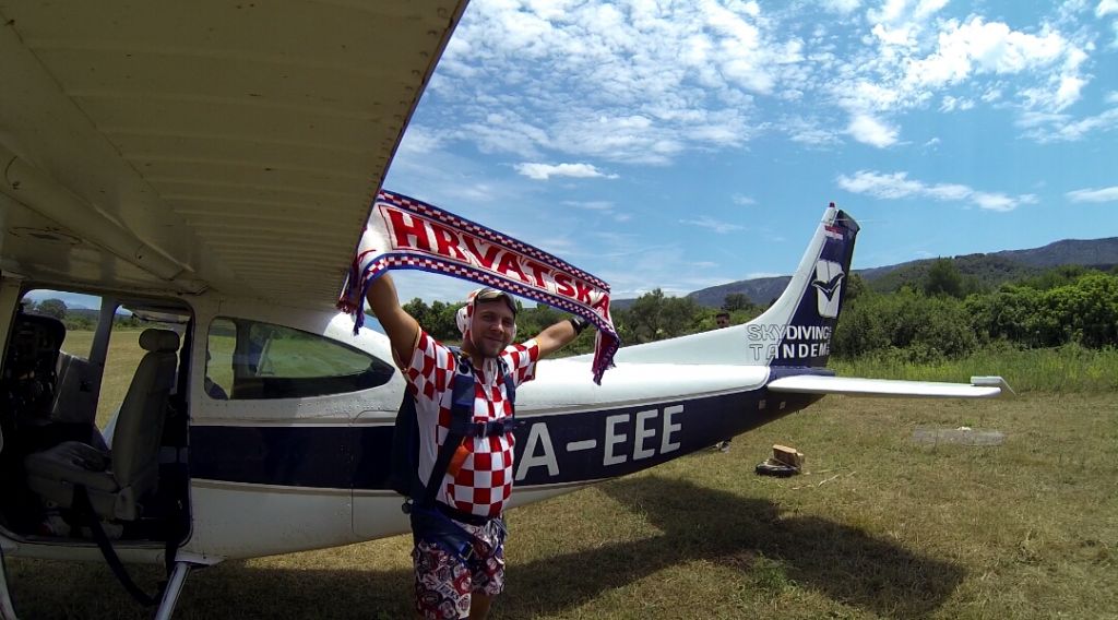 Skydiving Tandem grupa iz Zagreba ‘operira’ na Hvaru zadnjih šest ljetnih sezona, a Domagoj im se pridružio prošle sezone. Obzirom da je sve bliže utakmica hrvatske reprezentacije na Svjetskom nogometnom prvenstvu u Rusiji, Domach, kako ga zovu, i ekipa iz Skydiving Tandem grupe odlučili su dati podršku Vatrenima u slobodnom padu s 3.000 metara.