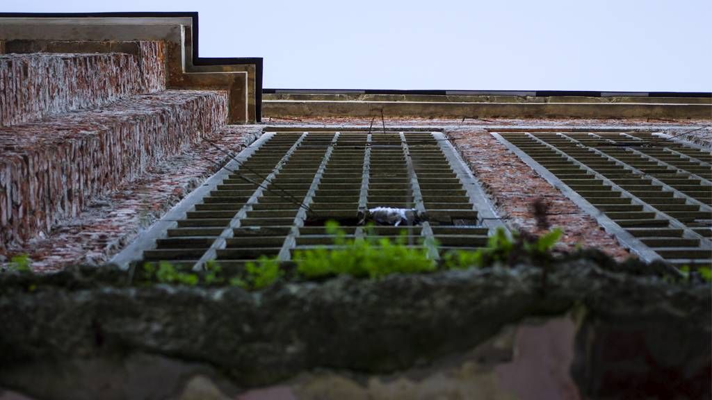 Unutrašnji zidovi su ružičaste boje, s ponekom ‘zakrpom’ na sebi. Svjetlost ulazi kroz prozor s prednje strane i ostaje zatvorena u koridorima. Možda radi smeća na podu.