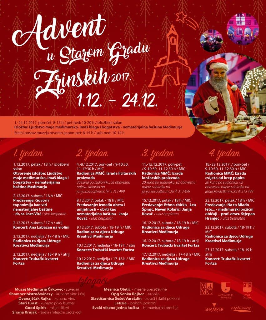 Cilj radionica je prezentirati pojedinu vještinu i prema principu “uradi sam” upoznati polaznike radionica s osnovnim tehnikama izrade. Izrađene predmete polaznici radionica mogu ponijeti u vrtić, školu ili kući. Advent u Starom gradu Zrinskih održavat će se petkom od 16 do 21 sat, subotama od 10 do 14 i od 16 do 21 sat te nedjeljama od 15 do 21 sati. Svakako čekaju nas zanimljivi i nezaobilazni sadržaji u četiri adventska tjedna, vezani isključivo za međimursku narodnu baštinu, naše pravo bogatstvo.