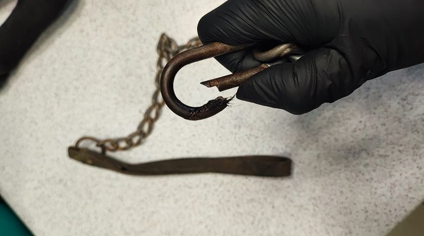 lanac koji mu je bio probušen kroz zadnju desnu nogu. Pas nema