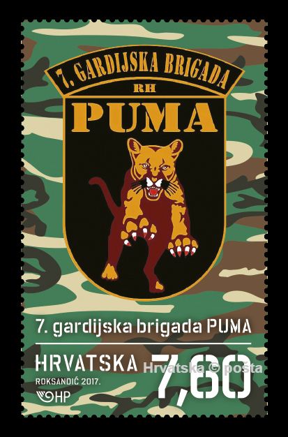 Motiv marke, amblem 7. gardijske brigade ‘Puma’, dizajnirao je Živko Skuhala, a za tisak ga je oblikovao Dean Roksandić, dizajner iz Zagreba.