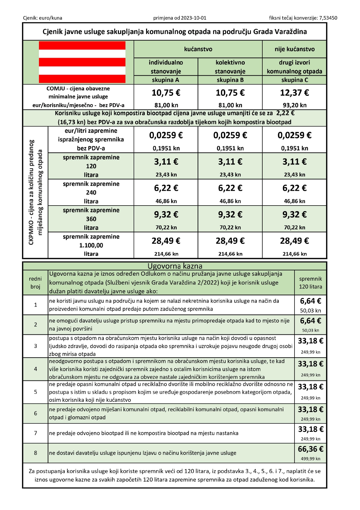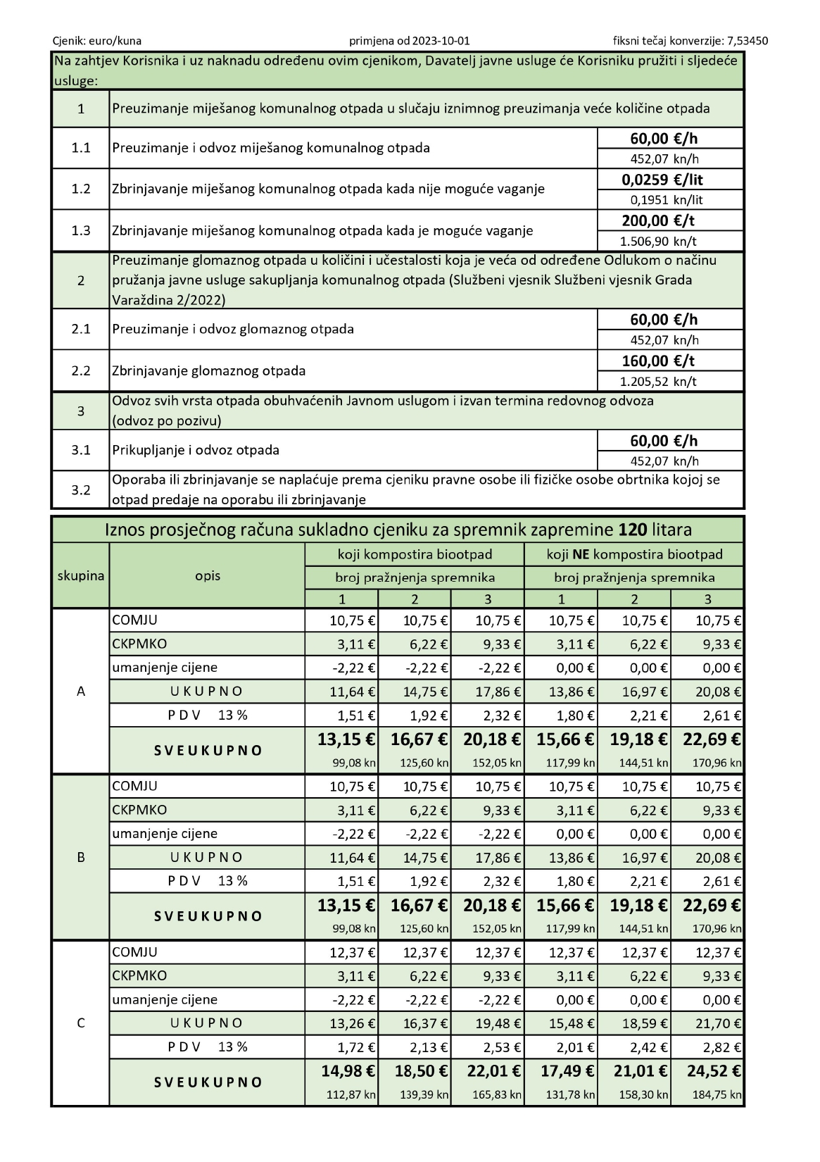 Novi cjenik, primjena od 1. listopada 2023., prijedlog u