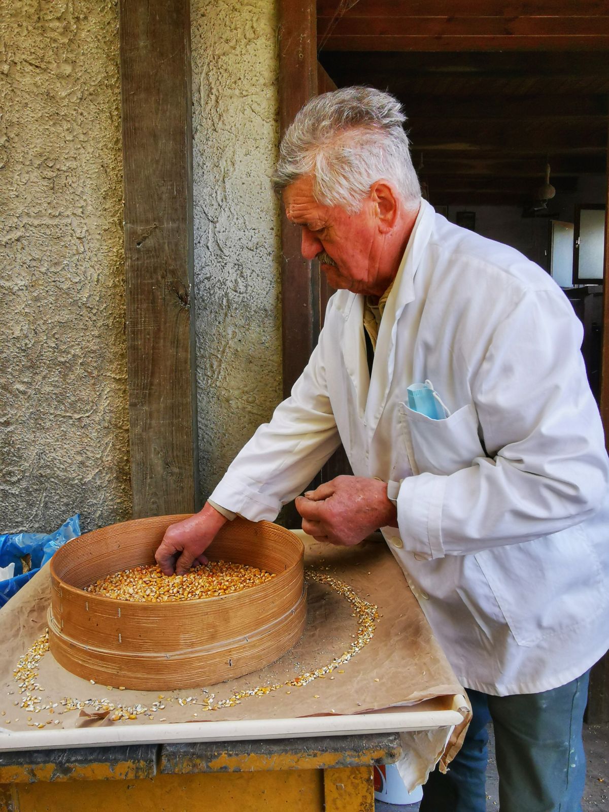 Diže se od stola i nosi novu rundu kukuruza u mlin. Prethodno ga