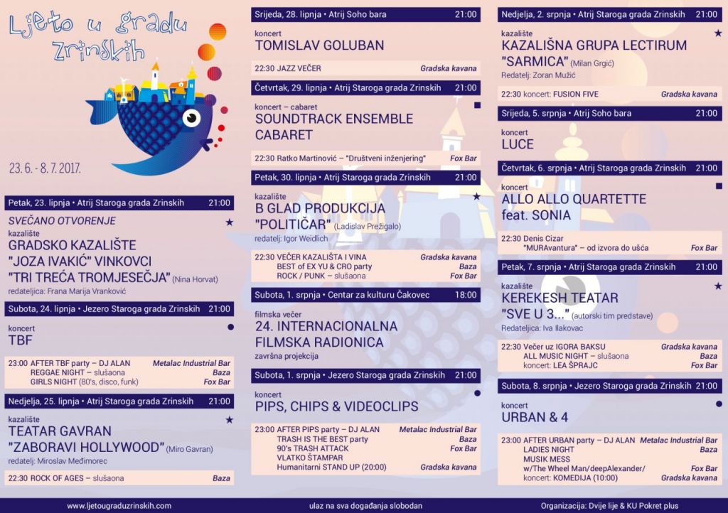 Glavna atrakcija Ljeta su koncerti koji se održavaju u jezeru podno Starog grada. U subotu, 24. lipnja nastupaju popularni Splićani TBF, dok će nas tjedan dana kasnije zabavljati Pips, Chips & Videoclips. Ljeto u gradu Zrinskih završava u subotu, 8. srpnja nastupom Urbana&4.