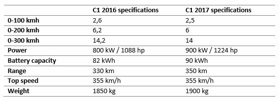 Pošto je šasija i veći dio automobila izrađen od karbonskih vlakana, težina cijelog automobila je 1900 kilograma, što je za električni automobil vrlo dobar rezultat, uz garanciju na bateriju dvije godine. Uz poneku promjenu od prošle godine, Concept One ima veću snagu i veći kapacitet baterije.
