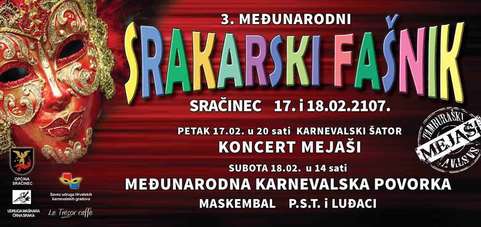 U petak, 17. veljače, u karnevalskom šatoru će prisutne zabavljati Mejaši, a u subotu, 18. veljače, od 14 sati kreće međunarodna karnevalska povorka, dok će za zabavu biti zaduženi Prvi srakarski tamburaši i Luđaci.