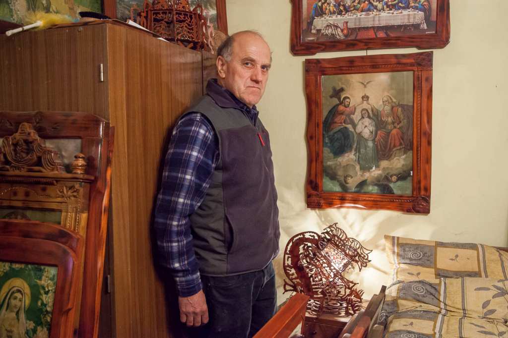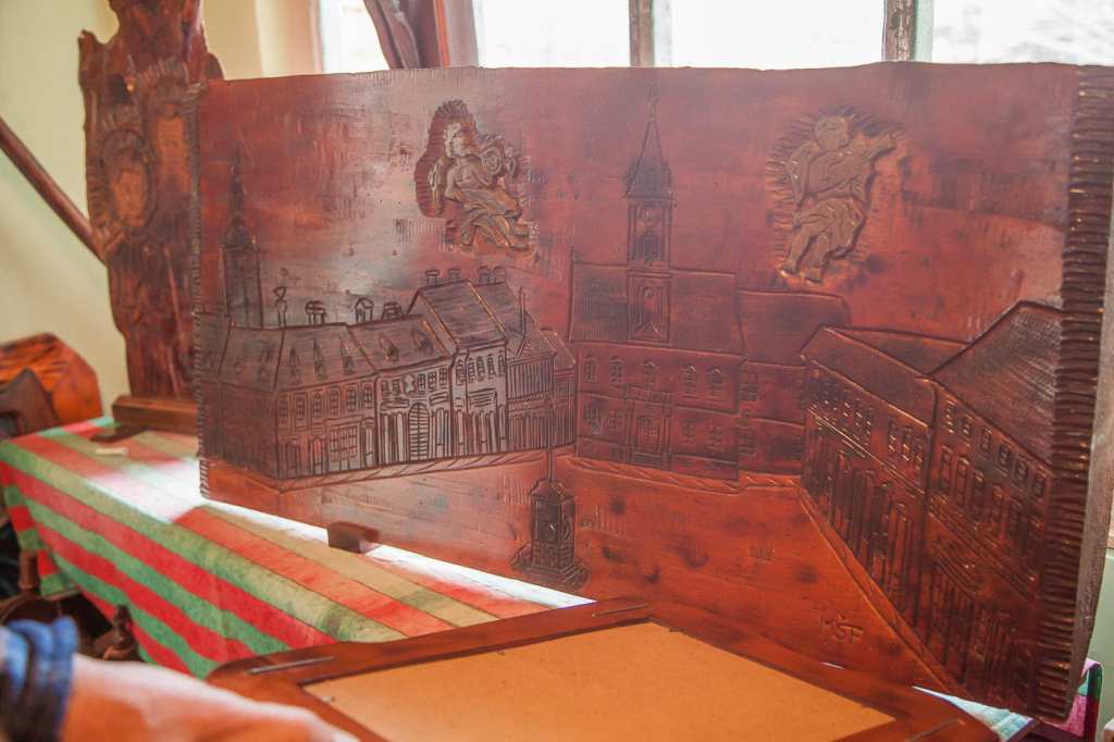 Nakon što smo pogledali njegovu radionicu s nebrojenim primjercima starih alata za obradu drva, odveo nas je u kuću koja postaje sve tjesnija od stotina slika i drugih njegovih radova u drvu.