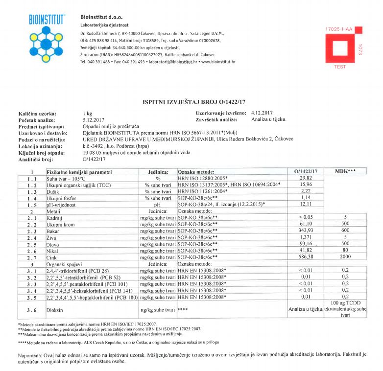 Danas kasno poslijepodne stigao je ispitni izvještaj iz laboratorija Bioinstituta na analizu otpadnog mulja dovezenog iz Zagreba, s nekoliko lokacija na međimurskim poljima.