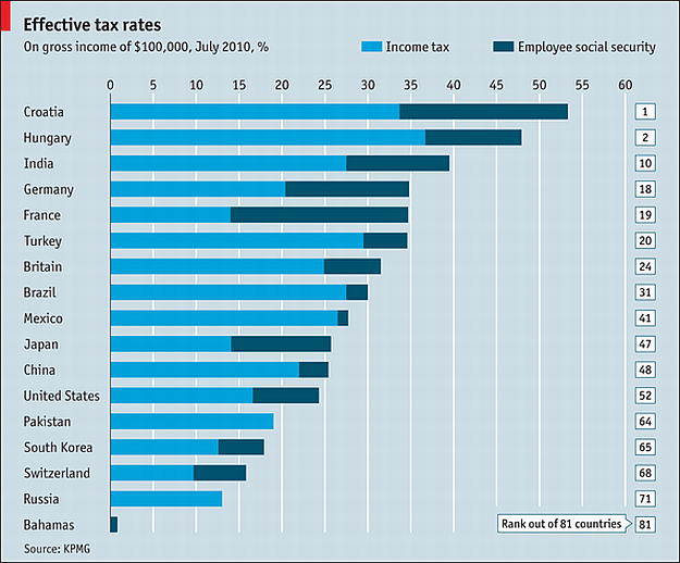 The Economist je u svoj izračun uključio ukupno 81 zemlju, a sasvim očekivano su na vrh ljestvice zasjele europske zemlje. Nažalost, Hrvatska predvodi kolonu. Prema grafu objavljenom na internetskim stranicama The Economista, Hrvati na zaradu od 100.000 dolara moraju platiti oko 54 posto poreza, od čega veći dio (oko 34 posto) otpada na porez na dohodak, dok se ostalo naplaćuje u doprinosima.