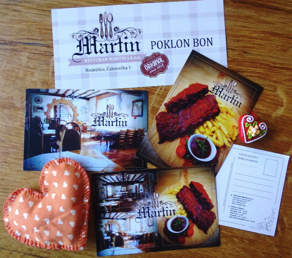 Uz sve navedene pogodnosti, u restoranu nude i mogućnost kupnje poklon bona (vrijednost po želji). Na izbor imate više vrsta bonova, od kojih su četiri tzv. “razglednice” iz restorana Martin. Zar postoji išta ljepše od osmijeha drage osobe ili poslovnog partnera kada mu poklonite bon restorana u vrijednosti koja vama odgovara?