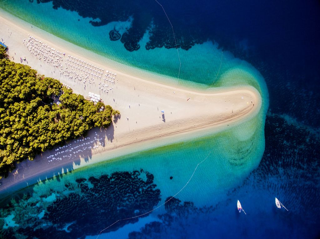 Prizor je to koji iz zraka prikazuje fascinantnu bračku odnosno bolsku plažu Zlatni rat, iz čiste okomite ptičje perspektive.